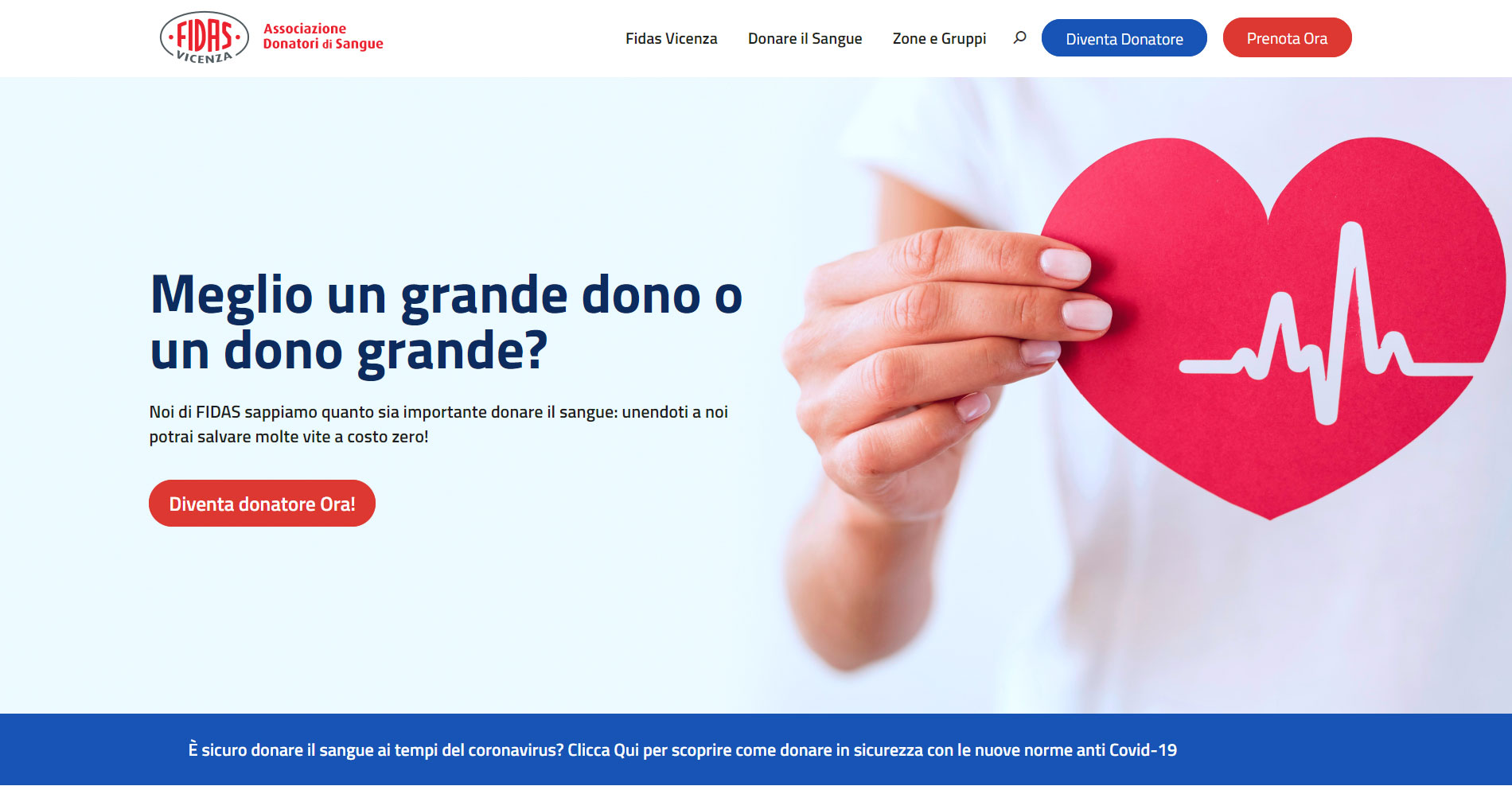 Dopo aver attuato un’analisi iniziale, abbiamo voluto creare uno stile grafico/visivo vicino alle altre associazioni di volontariato italiane ma sempre moderno e di facile navigazione. Il sito Fidas Vicenza è stato inoltre ottimizzato sia per una navigazione da desktop ma soprattutto da mobile per dare all’utenza garanzia di navigazione da qualsiasi dispositivo.